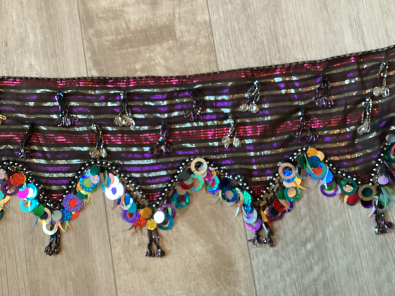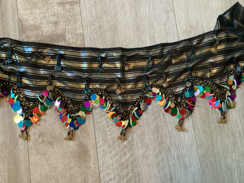 Zeer aparte heupsjaal in melaya-stof met diverse versieringen: kralenfranjes, pailletten in hoepelvorm en andere ornamenten. Maakt geen geluid.