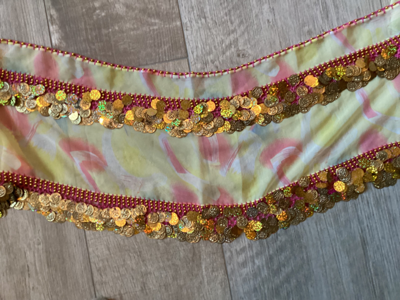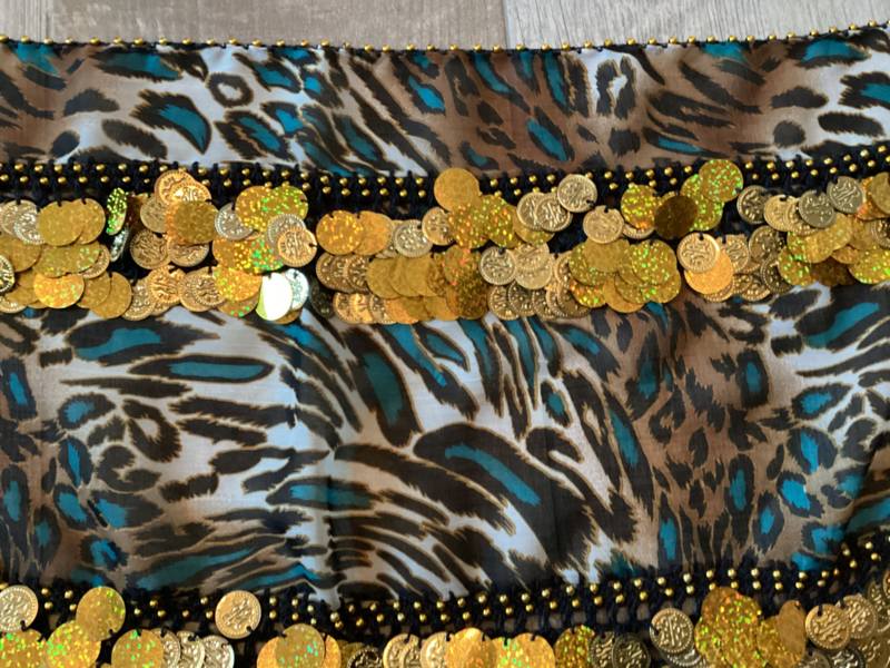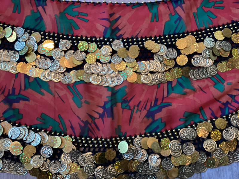 Batik rechthoeksjaal, hoogte ca 30 cm, met 2 rijen munten en pailletten.