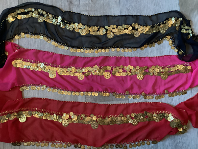 Rechthoeksjaal, hoogte ca 17 cm, 2 rijen goudkleurige munten, accent grote munt