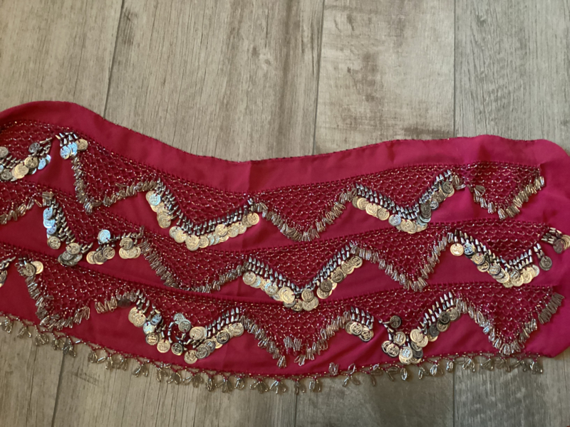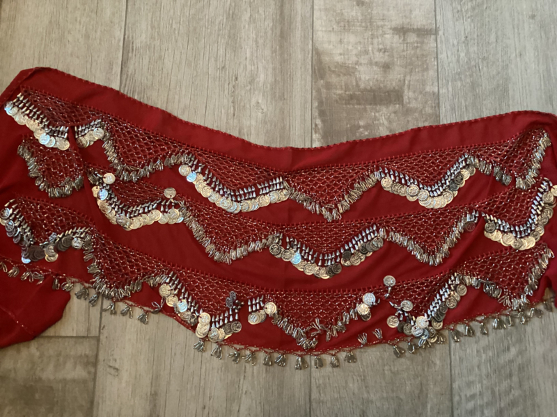 Heupsjaal piramides van kralen afgezet met zilverkleurige munten en pegels. Geeft een mooi, zacht rinkelend geluid.